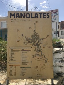 Manolates köyüne gelirken son olarak oldukça virajlı bir yolu takip etmeniz gerek ayrıca çok dar ( 12 km lik yolun yaklaşık son 4 km’si ) ama mükemmel bir orman ve yeşillikleri geçerek buraya ulaşıyorsunuz, tam köyün girişinde ücretsiz bir park yeri var, köy seramik ve takı sanatçıları ve onların sergileyip sattıkları eserler ile meşhur, dar sokakları ile çok güzel bir ambiansı var; ayrıca zirvede yer aldığından fotoğraflık ada manzarası mevcut…