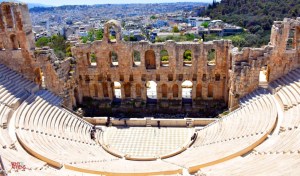 Akropolis’in güney yamacında bulunan ve buradan rahatlıkla görülebilen bu antik tiyatroya Kurucusu olan Herodes’in adı verilmiştir. Tiyatro 5000 kişi kapasitelidir. M.S. 165 yılında yapılan ve günümüze kadar oldukça sağlam şekilde gelen bu tiyaroda hala daha birçok konser ve Sanatsal etkinlikler düzenlenmektedir.
