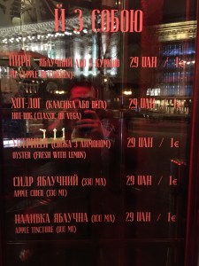 Khreshchatyk caddesi üzerinde gezerken yerel içecekler satan alkollü yada alkolsüz 7’den 70’e herkesin birşeyler alıp ayak üstü uğradığı bu küçük bar tarzı yerde lezzetli istiridyelerde satılmakta… ortalama fiyatlar 28 UAH (6 TL), buraya bir akşam uğramanızı tavsiye ediyorum…